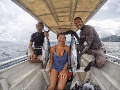 We did few long 1 hour drift but no sign of wahoo or Spanish mackerel. We saw lots of Unicorn fish but no sign of GT, or reef fish. Toward low tide the condition improve we started seing more life. Lots of rainbow runner and big school of unicorn fish. Not long after we start shooting the fish we came for. We got Wahoo and Spanish mackerel.